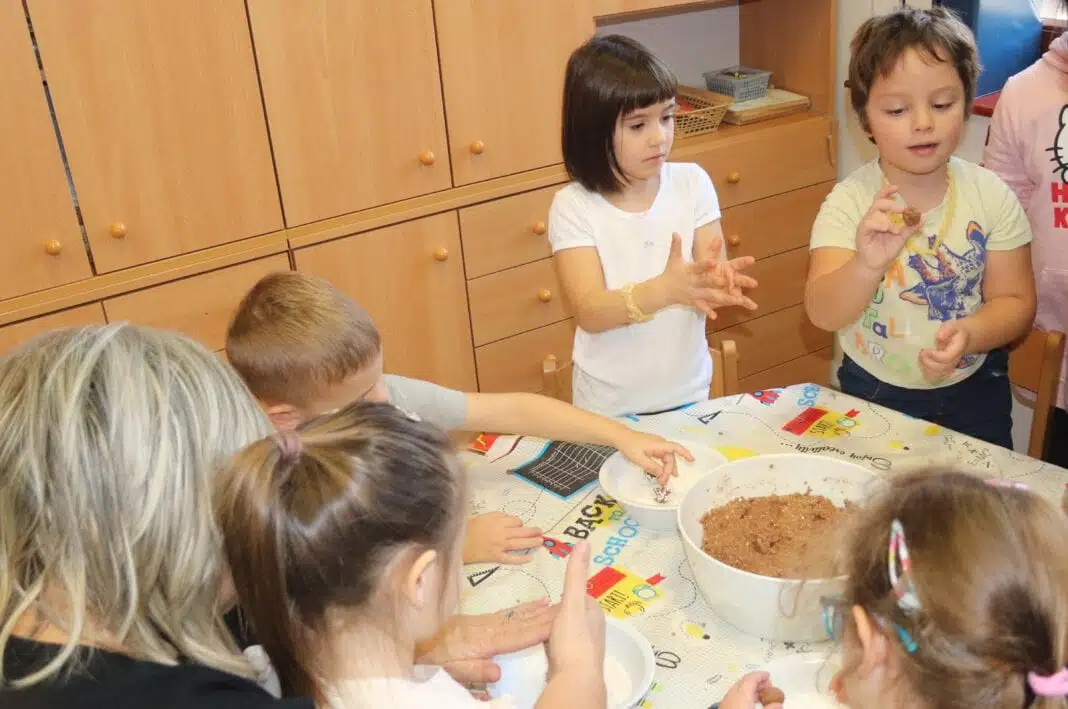 A mai napon először a Kesztyű mesét olvastam fel, ahol az állatok a kesztyűben sütnek, főznek, barkácsolnak. Ennek kapcsán mi is egy kis sütemény készítéssel készültünk. A nagymamák segítségével kókuszgolyót készítettünk, amibe a gyerekek is bekapcsolódtak. Kavarták a masszát és a golyókat is ők formálták, amit utána kókusz reszelékbe mártottak. A másik feladatban száraz, penna tésztából nyakláncot és karkötőt lehetett fűzni.