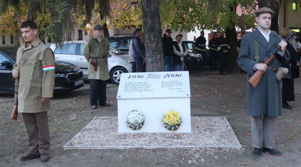 Az ünnepség a művelődési ház előtti parkban kezdődött, ahol a Himnusz hangjaira felhúzták a nemzeti színű zászlót. A műsorban közreműködtek a Buzás János Általános Iskola 7. osztályos tanulói, valamint az Első Lovashadosztály Magyarországi Hagyományőrző Csapatának képviselői, akik korhű öltözékükkel igyekeztek a 69 évvel ezelőtti események hangulatát megidézni. A megemlékezés részeként megkoszorúzták az 1956-os emlékművet.