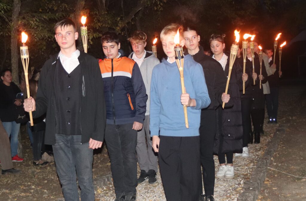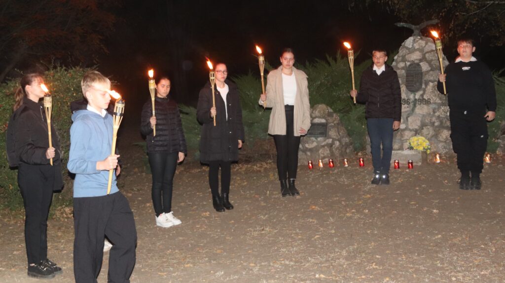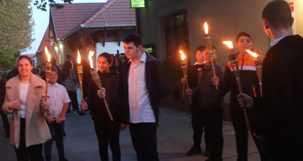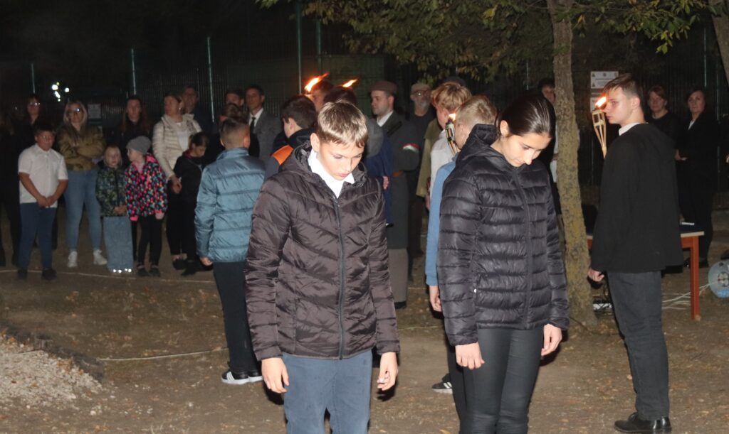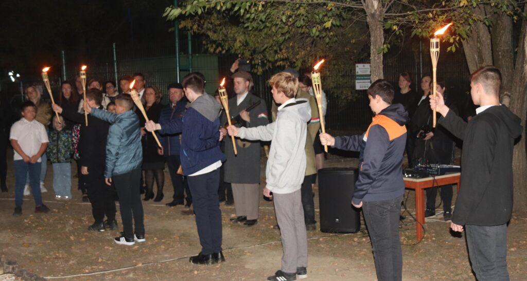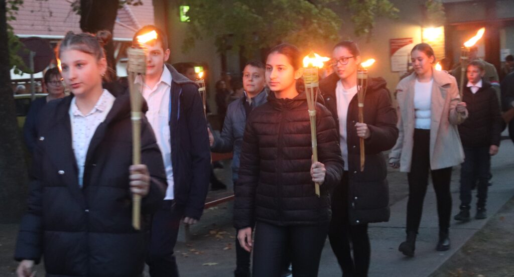 Ezt követően, a hagyományoknak megfelelően meggyújtották a fáklyákat, és az ünneplők, lassú, gyalog menetben, a mintegy egy kilométerre lévő millenniumi emlékműhöz vonultak, ahol a 7. osztályosok adták elő műsorukat, ami történelmi visszatekintés volt, és amit Szenekné Édes Kornélia tanított be.