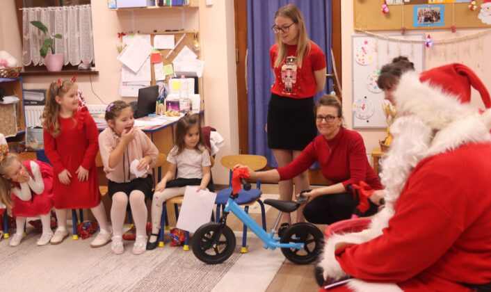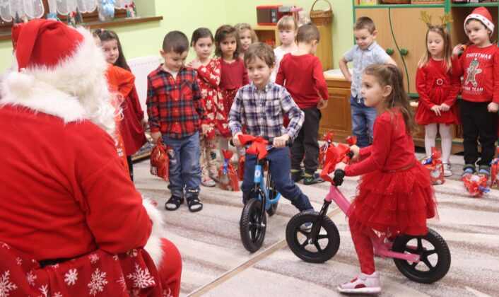 Ez a mostani Mikulás várás azonban más volt, mint a korábbi. Minden csoport ugyanis, a csomagokon kívül, amiben minden féle finomság volt, még egy kék és egy rózsaszínű futóbiciklit is kaptak, egy vállalkozó jóvoltából a gyerekek, amit ki is próbálhattak. Persze majd igazából az udvaron lesz annak hatása, amikor is felváltva ülhetnek rá és száguldozhatnak vele. Néhány gyerek azt kérdezte a télapótól, hogy estére elmegy-e hozzájuk. Amire a válasz természetesen az volt, hogy igen.