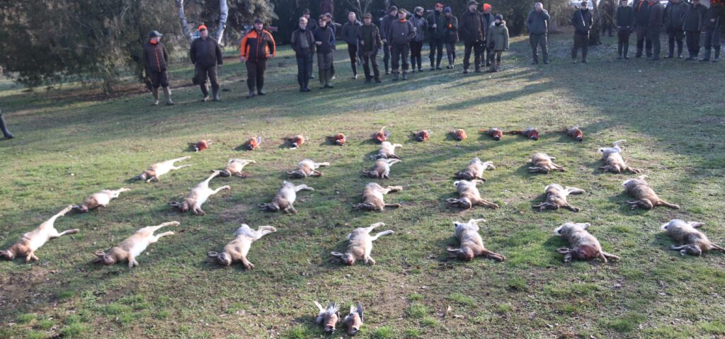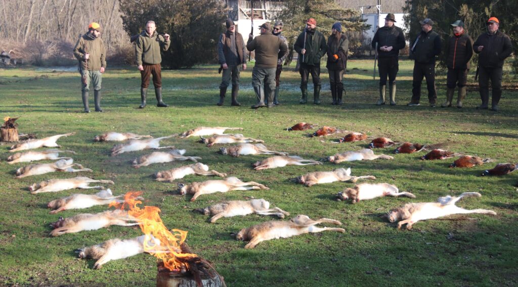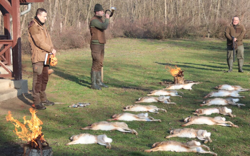 Ezúttal nem csak a társaság tagjai, hanem meghívott vadászok is részt vettek az év utolsó apróvad hajtóvadászatán. Összesen harminchét puska, nyolc hajtó és hét kutya segített abban, hogy a lelőtt madarak és nyulak terítékre kerüljenek.