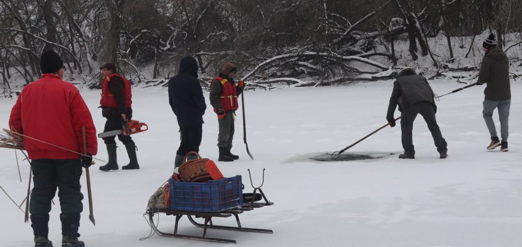 A szakember szerint a lék nagysága nem lehetett nagyobb egy négyzetméternél, mert akkor másfajta jelöléssel kellett volna ellátni. Így ennél kisebb darabot vágott ki a jégből, aminek mind a négy szélét háromszög alakban levágta. A nagyobb darab rész ment a jég alá, míg a háromszögek felállítva a lék oldalaira. Hogy minél jobban láthatóak legyenek, ágakkal, illetve nádakkal jelölték meg. A nagy darab kivágott résznek a jég alá csúsztatást, valamint a háromszög alakú sarkok kiemelését először megmutatta Kerekes József, hogy könnyebb legyen azoknak, aki ezt a munkafolyamatot végezték. Két segítség a gallyakat, nádszálakat hordta és jelölte meg a lékeket.