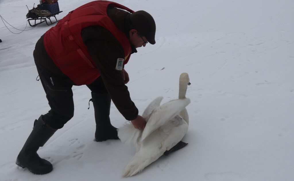A szabadstrandhoz közeledve lékhorgászokkal is találkoztak, akik maguk vágta léken próbáltak halat fogni. Már csak nem a kiértek a hídhoz, amikor egy legyengült hattyúval találkoztak. Kerekes József könnyedén meg tudta fogni és az utolsó kivágott lékhez vitte. Szerencsétlen madár nem győzött inni, jól érezte magát a kis vízfelületen. A halőr megígérte, hogy délután visz neki kukoricát, hátha erőre kap.