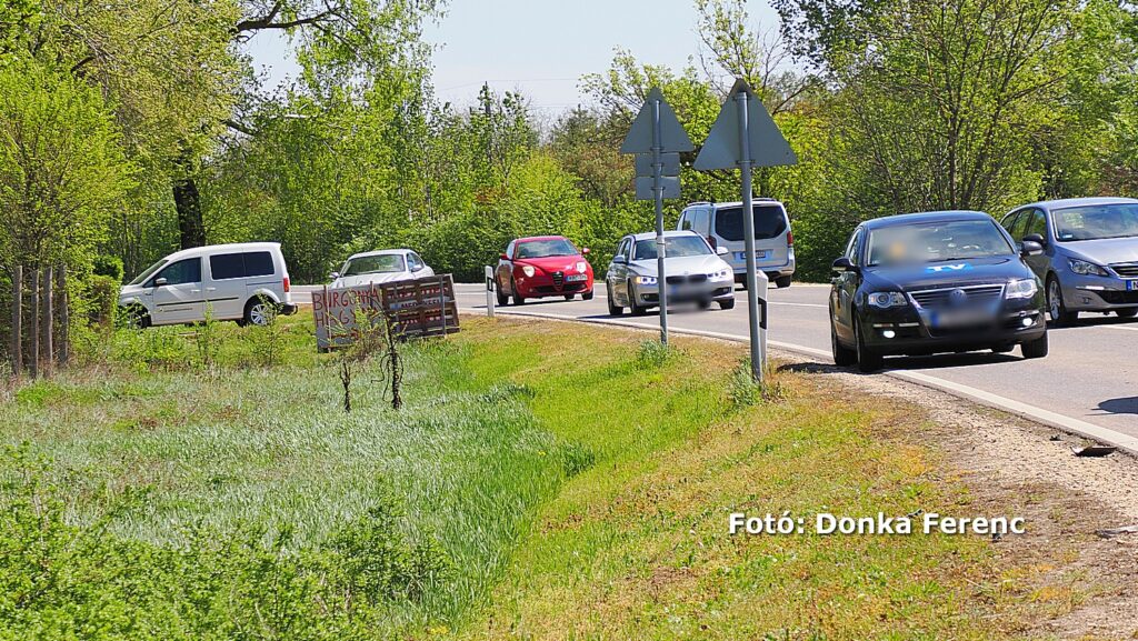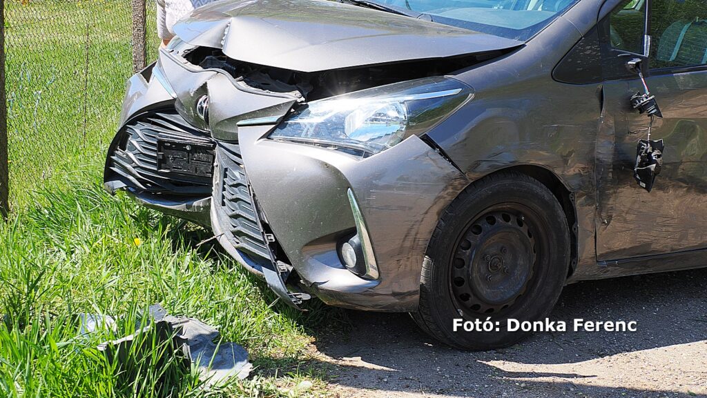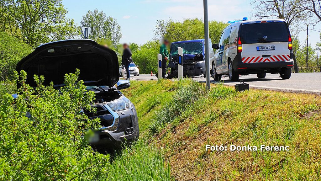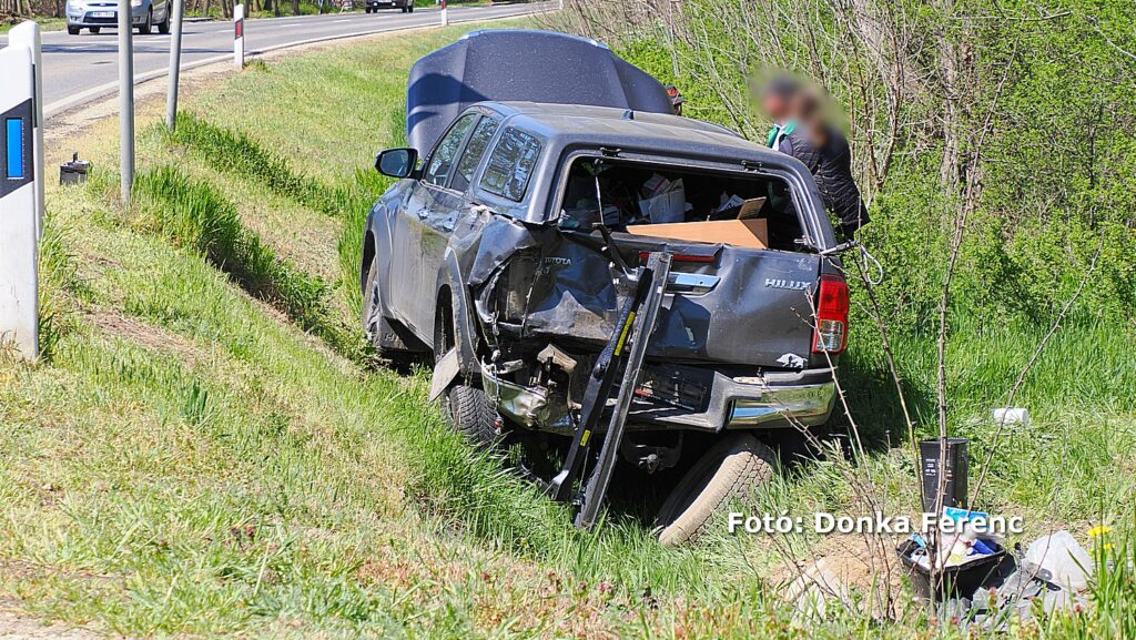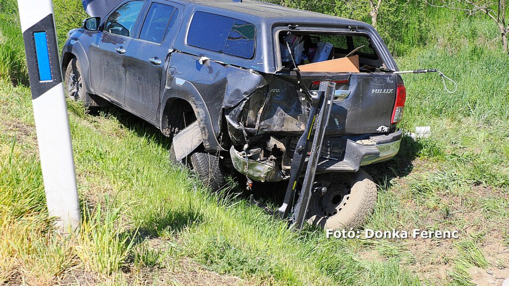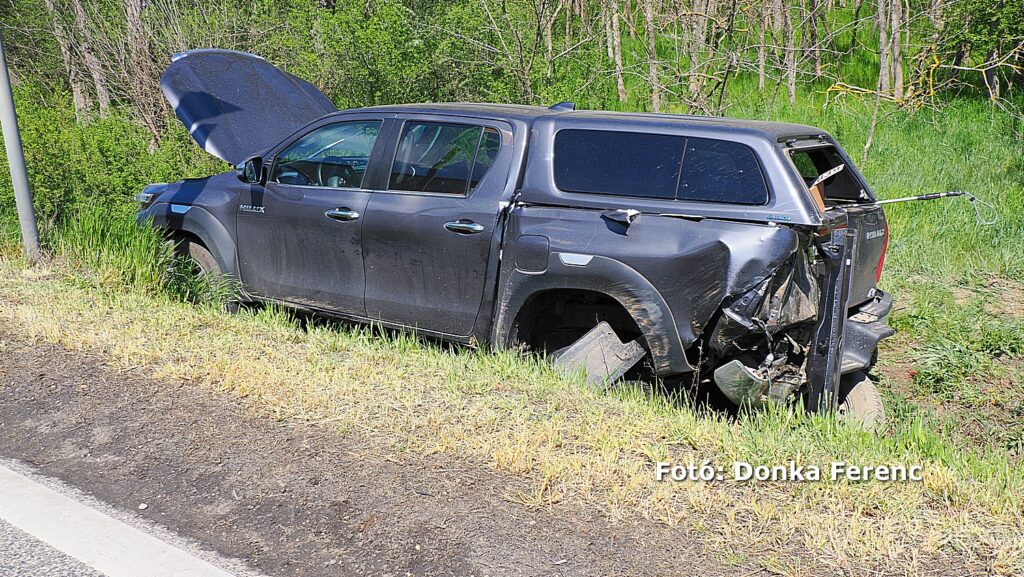 Egy szürke Toyota terepjáró akart balra nagy ívben kanyarodni, amikor a mögötte érkező kisteherautó vezetője ezt későn vette észre és nekiütközött. Ettől a kanyarodni szándékozó terepjáró átsodródott a másik sávba, ahol összeütközött egy személyautóval, amitől a terepjáró az árokba csapódott.